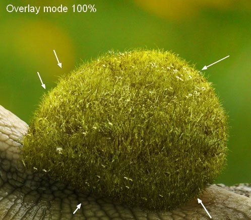 Выберите инструмент Затемнитель (Burn Tool) (O): диапазон Средние тона (Midtones), 10-15% экспозиция. Затемните нижний край улитки. Ниже вы увидите результат работы на слое в режиме Нормальный (Normal) и Перекрытие (Overlay)