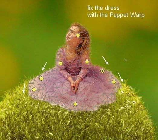 Активируйте режим Марионеточная деформация (Редактирование > Марионеточная деформация) (Edit > Puppet Warp). Измените форму платья девочки, чтобы оно правильно лежало на раковине.