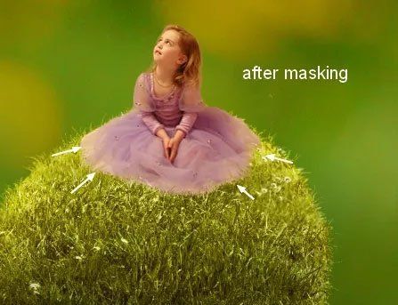 Добавьте маску к слою девочки и жёсткой кистью размером 2-3 пикселя погрузите платье в траву.