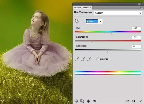 Уменьшите насыщенность цвета девочки корректирующим слоем Цветовой тон/Насыщенность (Hue/Saturation).