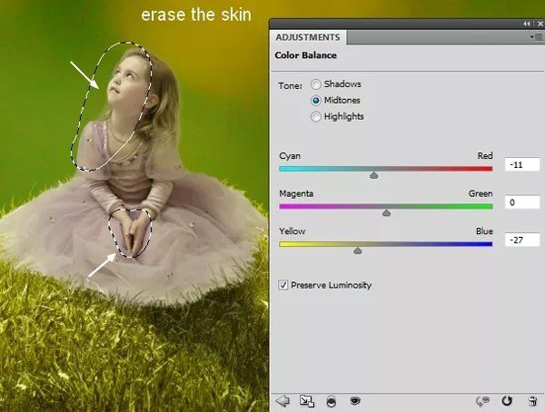 Создайте для девочки корректирующий слой Цветовой баланс (Color Balance), а затем на маске уберите зелёный оттенок с кожи.