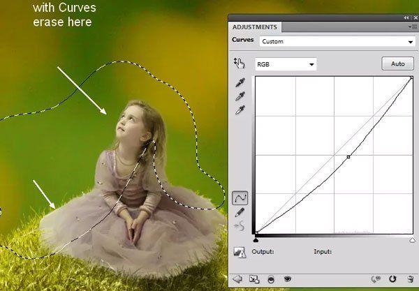 Создайте для девочки корректирующий слой Кривые (Curves). При помощи маски сотрите часть тени с лица и платья, на которые по нашей легенде падает свет.