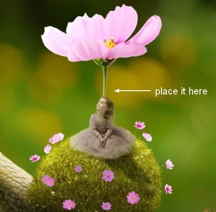 Откройте фотографии цветов в Фотошопе. Вырежьте бутоны, вставьте в основной документ и расположите их вокруг девочки. Опустите эти слои под слои девочки. При необходимости, дублируйте и трансформируйте цветы.