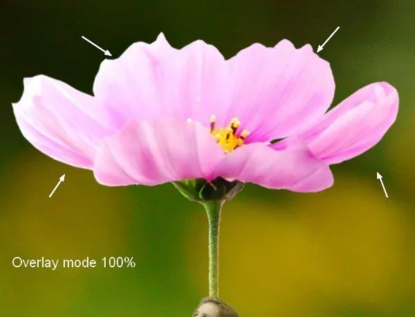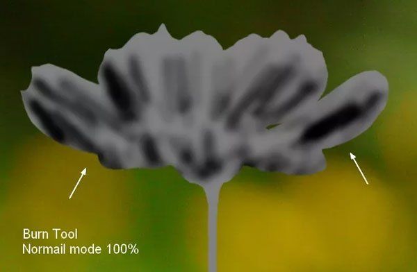 Создайте для цветка новый слой в режиме Перекрытие с 50% серым цветом.  Создайте из этого слоя обтравочную маску. Инструментом Затемнитель (Burn Tool) (O)  нарисуйте больше деталей.