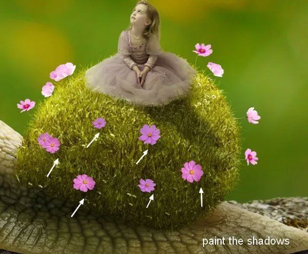 Для остальных цветков создайте такую же тень, как и у девочки, и у улитки.