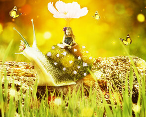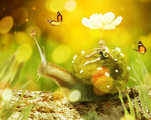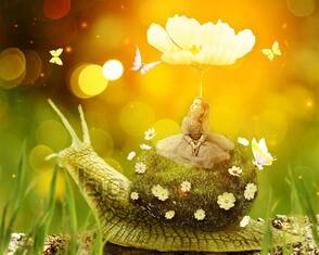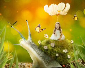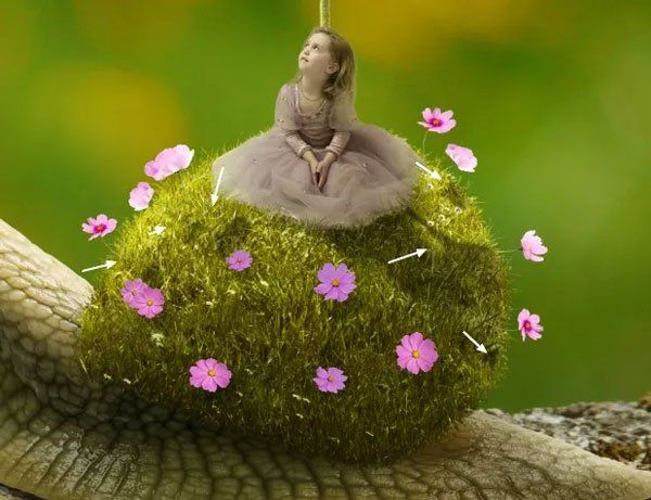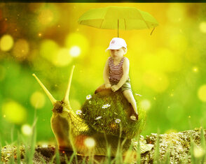 В этом уроке мы создадим волшебную сцену с маленькой девочкой, которая едет верхом на улитке. Вы узнаете, какими методами можно соединять объекты с разных фотографий. Помимо склейки мы будем работать над освещением, глубиной сцены и многим другим.