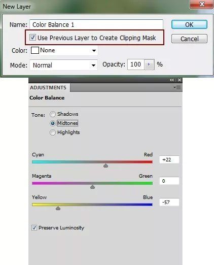 Создайте для фона корректирующий слой Цветовой баланс (Color Balance) (Layer > New Adjustment Layer > Color Balance/ Слой – Новый корректирующий слой – Цветовой балланс)  с обтравочной маской (Ctrl + Alt + G).