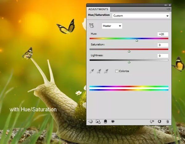 Поместите бабочек в группу (Ctrl + G). Измените их цвет корректирующим слоем Цветовой тон/Насыщенность (Hue/Saturation).