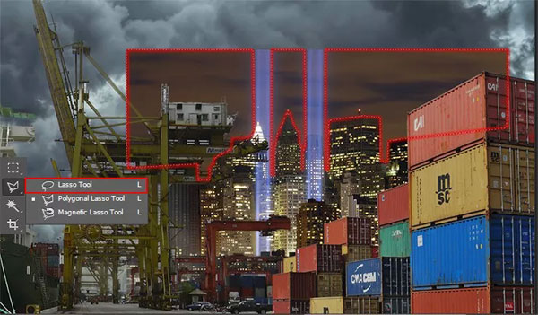 (Magic Wand Tool (W), выделите небо на изображении с контейнерами, а затем, удерживая клавишу ‘Alt’, добавьте слой-маску, чтобы удалить небо. Не трогайте асфальт на изображении, он нам ещё пригодится.