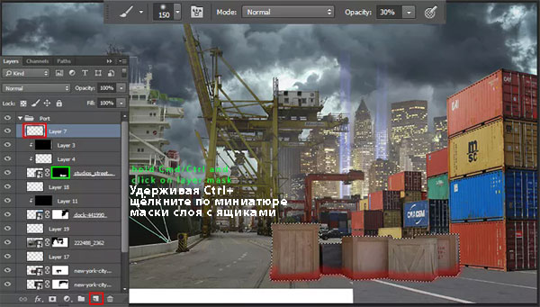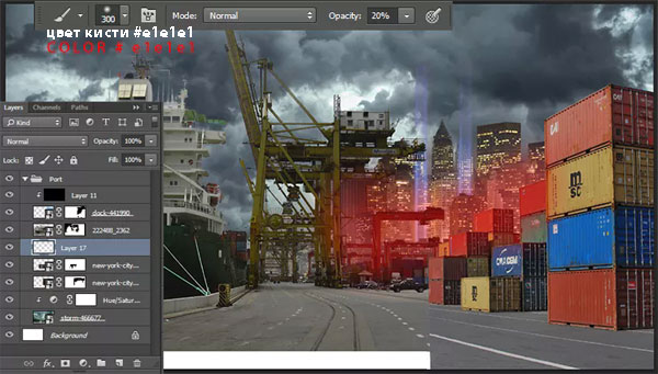 Создайте новый слой поверх всех остальных слоёв (Ctrl + Shift + N) или нажмите кнопку Создать новый слой (Create New Layer) через нижнюю панель инструментов. Нажмите клавишу (D), чтобы выставить цвета по умолчанию, а затем нажмите клавишу (X), далее, нажмите клавиши (Ctrl + Del), чтобы залить новый слой чёрным цветом. Уменьшите значение Заливки (Fill) до, примерно 20%, а также преобразуйте данный слой в обтравочную маску к слою с контейнерами. Чтобы преобразовать слой в обтравочную маску, удерживайте клавишу (Alt) + щёлкните мышкой между слоями. Таким образом, мы удалим лишнюю яркость на изображении с контейнерами.