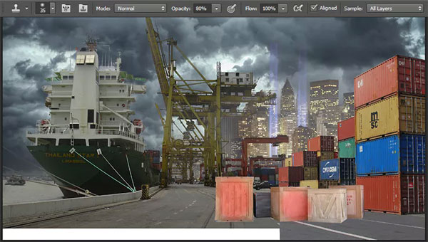 Теперь пришло время для штампа! Теперь, когда все ключевые элементы композиции размещены, мы можем приступить к работе над деталями. Создайте новый слой ниже слоя с ящиками, выберите инструмент Штамп