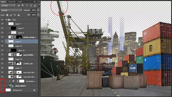 Верните Масштаб (Scale) до 100%, теперь, временно отключите видимость слоя с небом и слоя с задним фоном. С помощью инструмента штамп, удлините часть крана. На этом работа со штампом завершена. Возможно, вы заметили красное сооружение в правой части изображения. Я не стал ничего делать с ним, т.к. это сооружение не особо влияет на всё изображение, но если вы хотите, то вы можете восстановить данное сооружение.