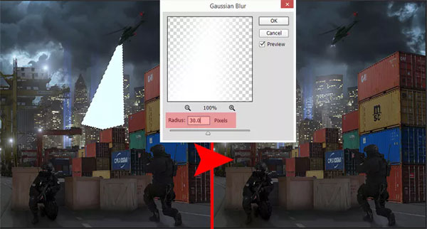 (Polygonal Lasso Tool (L). Создайте выделение, напоминающее фигуру вытянутого треугольника, исходящее от вертолёта. Залейте активное выделение белым цветом (нажмите клавишу ‘D’, чтобы выставить цвета по умолчанию, а затем нажмите клавиши (Ctrl + Del), далее, нажмите клавиши (Ctrl + D), чтобы отменить выделение. Размойте слой, чтобы получить мягкий рассеянный свет. Идём фильтр – Размытие- Размытие по Гауссу (Filter > Blur > Gaussian Blur). Установите Радиус (Radius) размытия 30 px. В результате мы получим хороший поток света. Вы можете усилить источник света с помощью кисти.