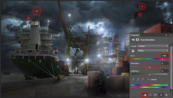Для сигнальных огней на вертолёте и на корабле, я использовал исходное изображение “15”, но вначале создайте новую группу внутри группы с бликами, добавьте блики в созданную группу, расположив их в нужных местах. Далее, добавьте корректирующий слой Цветовой тон / Насыщенность (Hue/Saturation). Установите значение Цветового тона (Hue) примерно +108 (вы можете установить другое значение, чтобы получить более насыщенные цвета). И не забудьте преобразовать данный корректирующий слой в обтравочную маску через нижнюю панель инструментов.