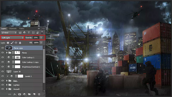 Данный шаг является выборочным. Картина готова, но я решил добавить немного контраста, чтобы сделать ночь более тёмной. Это просто, нажмите клавиши (Ctrl + Alt + Shift + E), чтобы создать дубликат всего изображения, далее, поменяйте режим наложения для объединенного слоя на Мягкий свет (Soft Light), а также уменьшите Непрозрачность (Opacity) слоя до 25%.