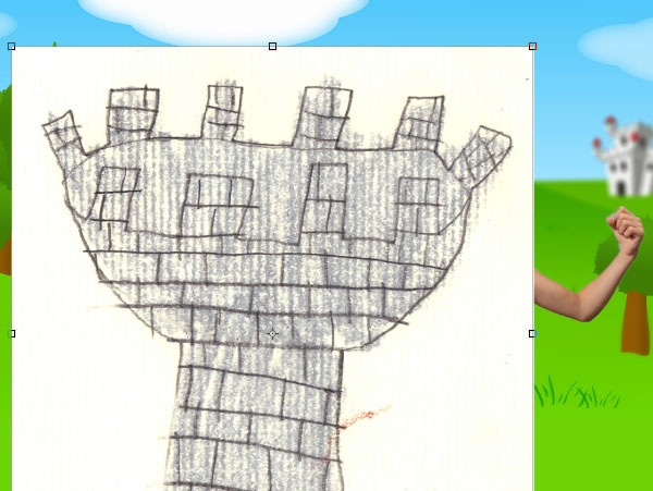 Обратили внимание на прозрачный контур квадрата вокруг башни с маленькими квадратиками по контуру? Это опорные точки трансформации, с их помощью вы можете изменить размеры башни. Если вы потяните за угловую опорную точку, то вы сможете увеличить или уменьшить башню. То же самое вы можете проделать с изображением принцессы. Только не забудьте вначале щёлкнуть по слою с изображением принцессы. Итак, расположите башню и принцессу, как показано на скриншоте ниже.
