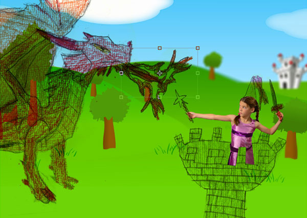 Используя ту же самую технику, добавьте изображение дракона, а также другие детали рисунка. Создайте выделение, скопируйте, а затем вернитесь на наш рабочий документ, чтобы вклеить скопированное изображение. Используйте опорные точки трансформации, чтобы смещать, поворачивать, менять размер каждого элемента сцены. Вот так выглядит моя картина!