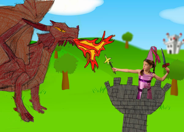 Как только вы разработали план, воодушевите своего ребёнка нарисовать элементы сказочной сцены. Объясните ребёнку, что будет отлично, если он нарисует каждый элемент отдельно. В нашем проекте, моя дочь нарисовала дракона на одном листе бумаги, а на другом листе бумаги она нарисовала башню и оружие, которое она будет использовать во время сражения с драконом.