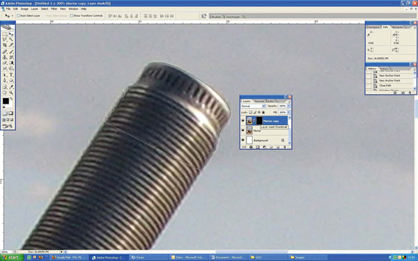 (Pen tool) с режимом Контур (Path). Приблизьте изображение на 300%, затем нарисуйте контур вокруг дула миномета. Перейдите на панель Контуров (Paths) и сгенерируйте выделение своего контура (Ctrl + клик по миниатюре). Дублируйте слой с минометом, затем перейдите в меню Слои > Слой-маска > Показать выделенную область (Layer > Layer Mask > Reveal Selection). Кликните по маске слоя, после чего примените Размытие по Гауссу радиусом 0,8 пикселей. Для этого перейдите в меню Фильтр > Размытие > Размытие по Гауссу (Filter > Blur > Gaussian Blur).
