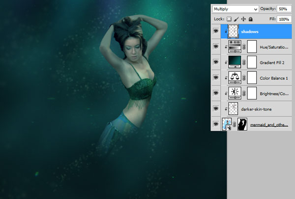 Примечание переводчика: к слою с подводной сценой автор добавил слой-маску и с помощью мягкой чёрной кисти скрыл проблемный участок на слой-маске слоя.