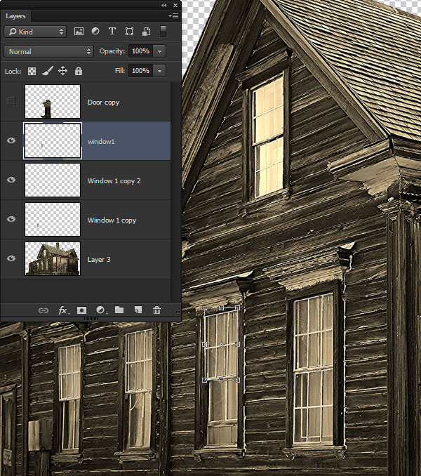 Яркий блеск остальных окон не подходит к нашей сцене с тёмным лесом. Временно скройте видимость слоя с дверью, а затем выделите верхнюю часть первого окна (то окно, которое без яркого блеска на стекле). Скопируйте выделенную часть на новый слой, расположив дубликат верхней части окна поверх верхней части второго окна. Используйте трансформацию Редактирование – Трансформация - Искажение (Edit > Transform > Distort), чтобы верхняя часть подошла к окну после перемещения. Дважды продублируйте слой с верхней частью окна, чтобы расположить дубликаты поверх остальных окон.