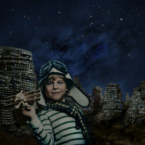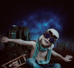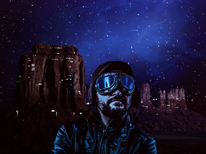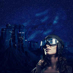 В качестве заключительного штриха, возвращаемся на слой с небом и создаём объединённый слой с небом, со звёздами и туманностью. Далее, используя полученную текстуру неба, вырежьте фигуры под форму очков пилота. Просто преобразуйте слой с текстурой неба в обтравочную маску к слою с пилотом, а затем поменяйте режим наложения на Осветление (Screen), далее, добавьте слой-маску, чтобы скрыть изображение вокруг линз очков.