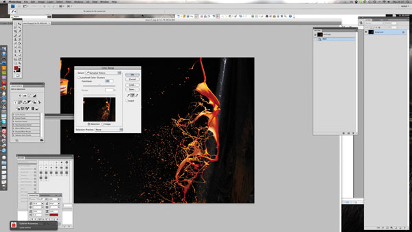Откройте stock3.jpg, или же, вы можете использовать собственные аналогичные изображения. Цвет краски не имеет значения. Снова нажмите Select > Color Range... (Выделение – Цветовой диапазон...) и выберите оранжевый цвет (или тот цвет краски, с которым вы работаете), установите Fuzziness (Разброс) на 100. Нажмите на иконку пипетки с плюсом, она добавит цвет к образцу, и кликните на другом оттенке оранжевого. Продолжайте, пока не будут собраны образцы всех цветов, которые вам нужны. Кликните ОК.