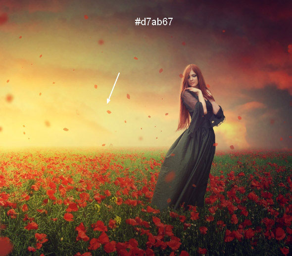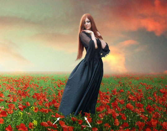 К слою с моделью, добавьте слой-маску и с помощью жёсткой кисти чёрного цвета, обработайте нижнюю часть платья модели, чтобы создать ощущение, как будто она стоит среди цветов:
