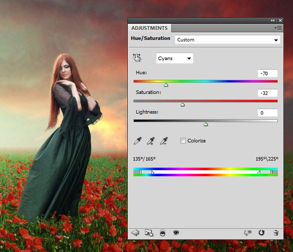 Далее, к слою с моделью, добавьте корректирующий слой Цветовой тон / Насыщенность (Hue/Saturation), чтобы изменить цвет платья модели под цвет травы: