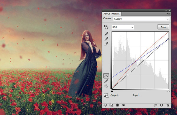 Добавьте корректирующий слой Кривые (Curves) поверх всех остальных слоёв. Установите кривые, как показано на скриншоте ниже: