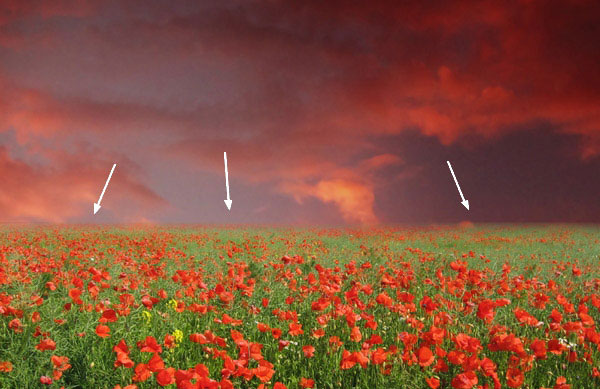(RetangularMarqueeTool (M), выделите только изображение поля. Скопируйте / вклейте выделенную часть изображение на наш рабочий документ, расположив фрагмент с полем в нижней части нашей сцены, как показано на скриншоте ниже: