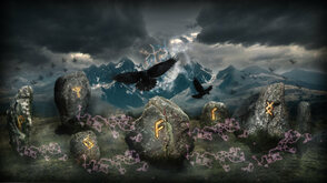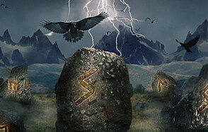 На первом плане - камень с руной Турисаз, что означало "шип, колючка" и одновременно передавало имя Тора. На втором плане - камень с руной А́нсуз, бог или представитель рода Асов, основных скандинавских богов.