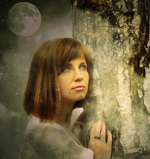 Откройте исходное изображение с деревом. Скопируйте / вклейте изображение дерева на наш рабочий документ. Расположите дерево поверх изображения головы модели. К слою с деревом, добавьте слой-маску, чтобы скрыть фрагменты дерева, которые закрывают лицо девушки, при этом, сохраняя ветви дерева на волосах девушки. Уменьшите Непрозрачность (opacity) слоя до 60%.