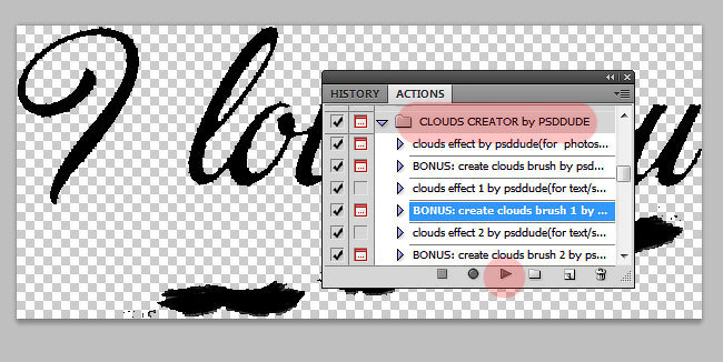 Чтобы создать текст с эффектом облаков, я использовал Экшен Облака, который вы можете скачать по ссылке в начале этого урока. Вы можете также использовать данный экшен в других своих проектах. Установите все файлы, необходимы для работы данного экшена. Нажмите кнопку (Play), чтобы запустить экшен "BONUS: create clouds brush 1" из набора экшенов.