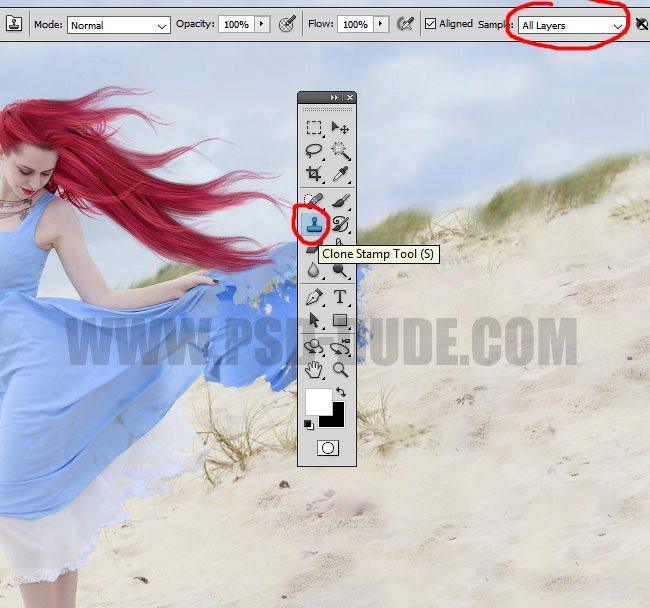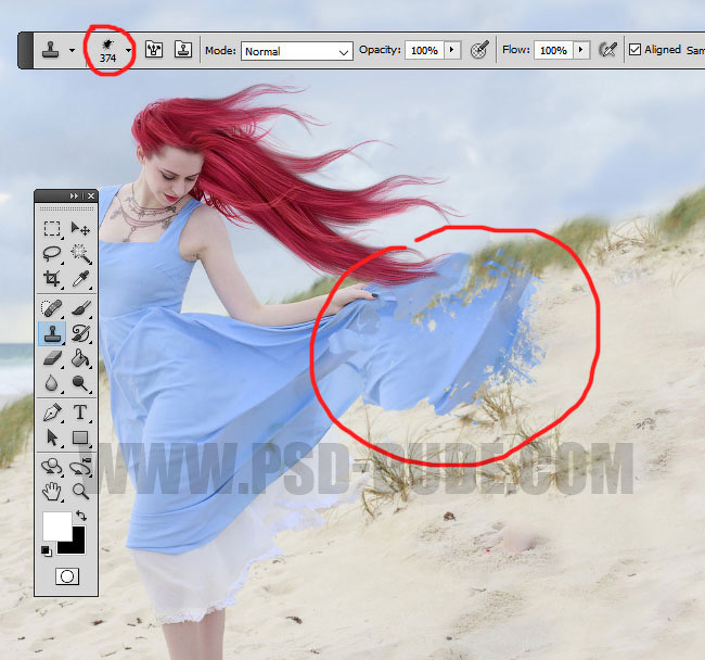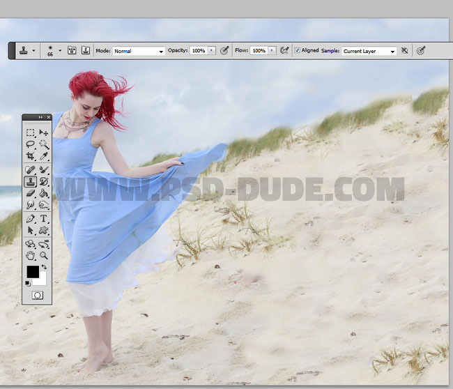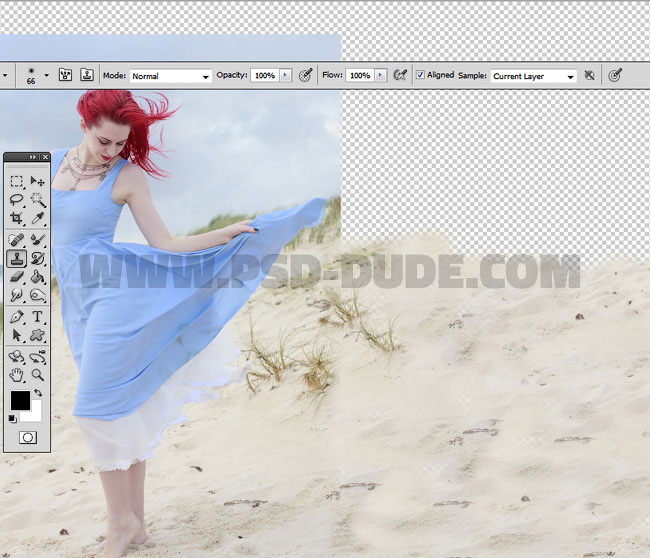 (Clone Stamp Tool), чтобы заполнить образовавшееся пустое пространство текстурой песка и травы и воссоздать задний фон, как на оригинальном изображении. Используйте мягкую круглую кисть в качестве инструмента для клонирования. Удерживая клавишу (ALT), щёлкните по текстуре песка, чтобы отобрать образец для клонирования. Просто используйте инструмент, чтобы прокрасить поверх пустых участков изображения.