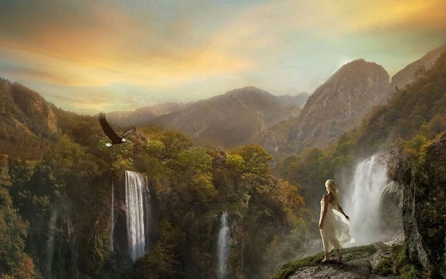 Вначале мы создадим основную нашу сцену, включая горы, водопады и небо. Далее, мы проведём коррекцию каждого фрагмента сцены с помощью корректирующих слоёв. Также мы дополнительно добавим исходные изображения к нашей сцене, такие как водопады, орла, используя технику совмещения. После этого, мы добавим изображение модели и совместим её с помощью светотеней и корректирующих слоёв. В конце мы поработаем над световыми эффектами и в заключение, мы проведём заключительную коррекцию с помощью корректирующих слоёв. Хочу обратить ваше внимание, что для выполнения данного урока я использовал программу Adobe Photoshop CC 2014, но вы можете воспользоваться программой Photoshop CS3 или выше.