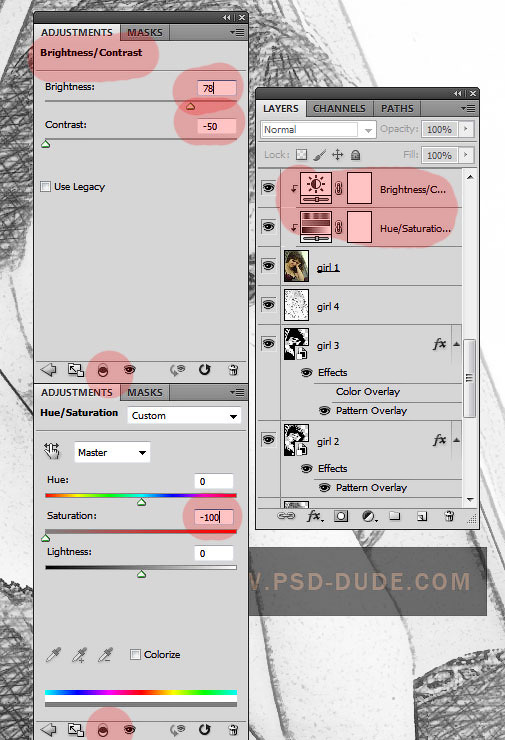 Подсказка! Если не обесцвечивать слой Девушка 1 (Girl 1 Layer), то у вас получится эффект цветного карандашного рисунка, который также отлично смотрится. Или вы можете добавить коррекцию Цветовой тон / Насыщенность (Hue/Saturation) и с помощью опции тонирование (colorize) добавить цветовой эффект.