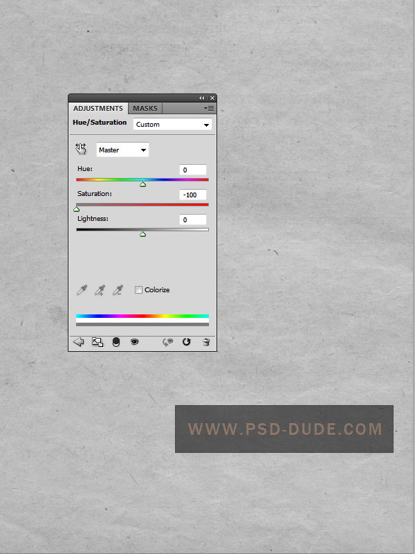 Примечание переводчика: чтобы обесцветить текстуру, идём Слой - Новый корректирующий слой – Цветовой тон / Насыщенность (Layer – New Adjustment layer – Hue / Saturation). В окне настроек данного корректирующего слоя, уменьшите значение Насыщенности (Saturation) до -100.