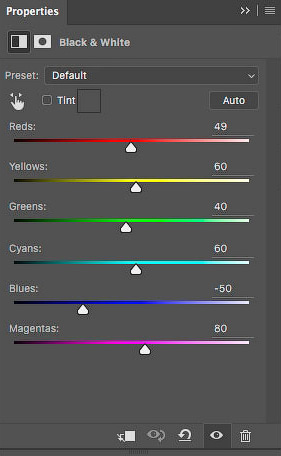Кликните по иконке корректирующего слоя "Черно-белое" (Black-&-White Adjustment Layer) на панели Корректирующих слоев (Adjustments panel), сделав снимок монохромным. Таким образом, мы конвертируем фотографию не деструктивно, а также сможем получить доступ к оригинальным цветам, если это потребуется.