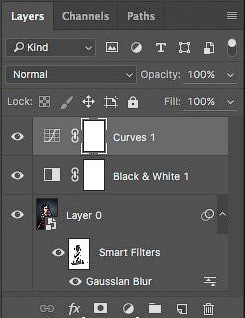 Сначала кликните по нижнему левому углу линии Кривых (Curves), затем перетяните точку немного вправо и вверх, подавив часть оттенков черного.