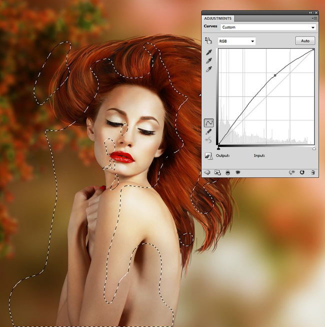 Создайте корректирующий слой Curves (Кривые), чтобы усилить свет и контраст модели. Свет на модель падает справа и более заметен на верхней части тела. На маске этого слоя, используйте мягкую черную кисть, чтобы уточнить свет и тень на модели, что сделает свет сильнее на плече, щеках и волосах. Вы можете посмотреть результаты на маске и на картинке: