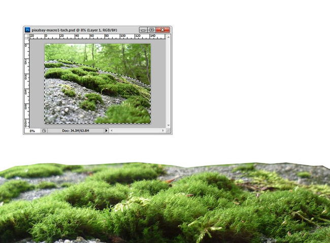 Откройте второе исходное изображение с грибами 2. Отделите изображение грибов от заднего фона, а затем переместите выделенное изображение грибов на наш рабочий документ, расположив их в левом нижнем углу сцены. Проведите совмещение грибов с лишайником с помощью слой-маски.