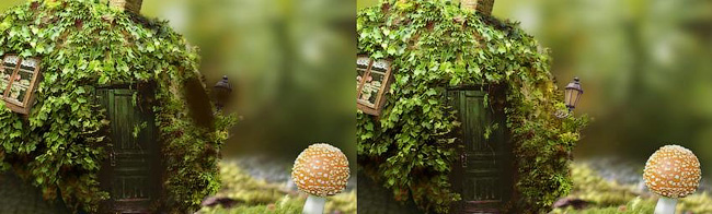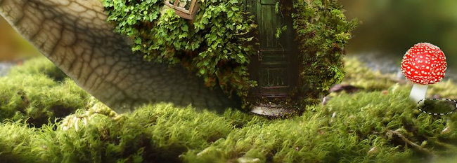 Вначале мы создадим базовую сцену с помощью двух исходных изображений с лишайником. Далее, мы добавим изображение улитки и покроем раковину вьющимися растениями. После этого, мы добавим окошко, дверь, грибы, дымоход, дымок, а также фонарь и совместим все эти элементы с помощью корректирующих слоёв, работы с маской и кистями.