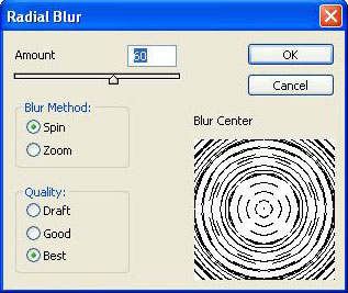 Перейдите в Фильтр - Размытие - Радиальное размытие (Filter - Blur - Radial blur) и установите такие параметры: