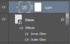 Щёлкните правой кнопкой мыши по слою с лошадью и в появившемся окне выберите опцию Парметры наложения (Blending Options). Примените стили слоя Внутреннее свечение (Inner glow) и Внешнее свечение (Outer glow), чтобы придать лошади волшебный вид.