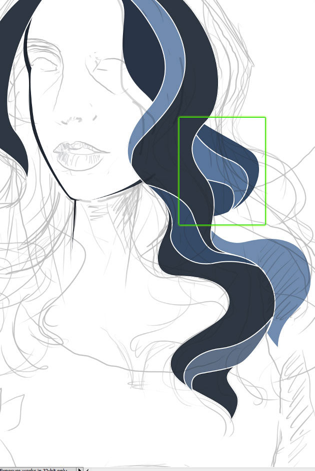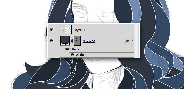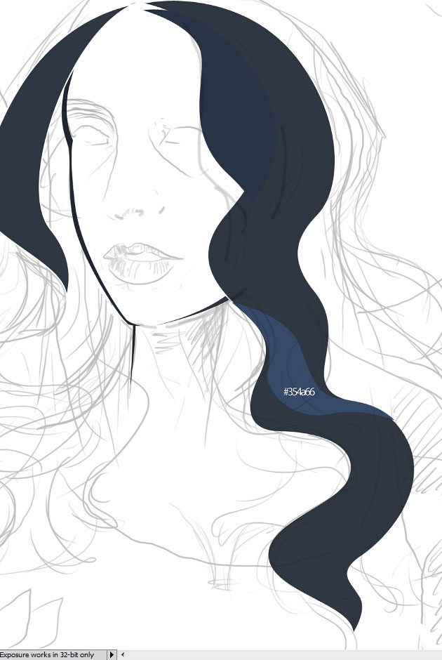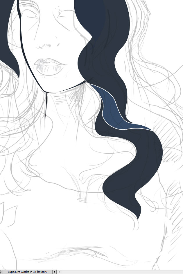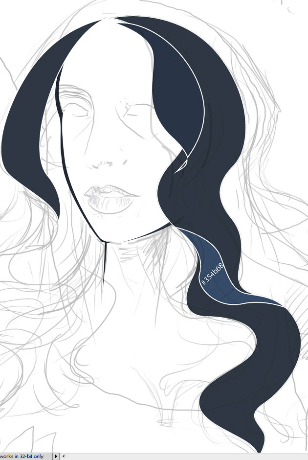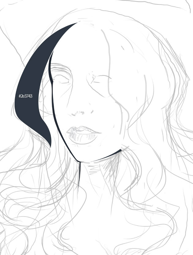 Далее добавляем волнистые фигуры для прорисовки волос. Используем цвет #2e3743 и #354a66.