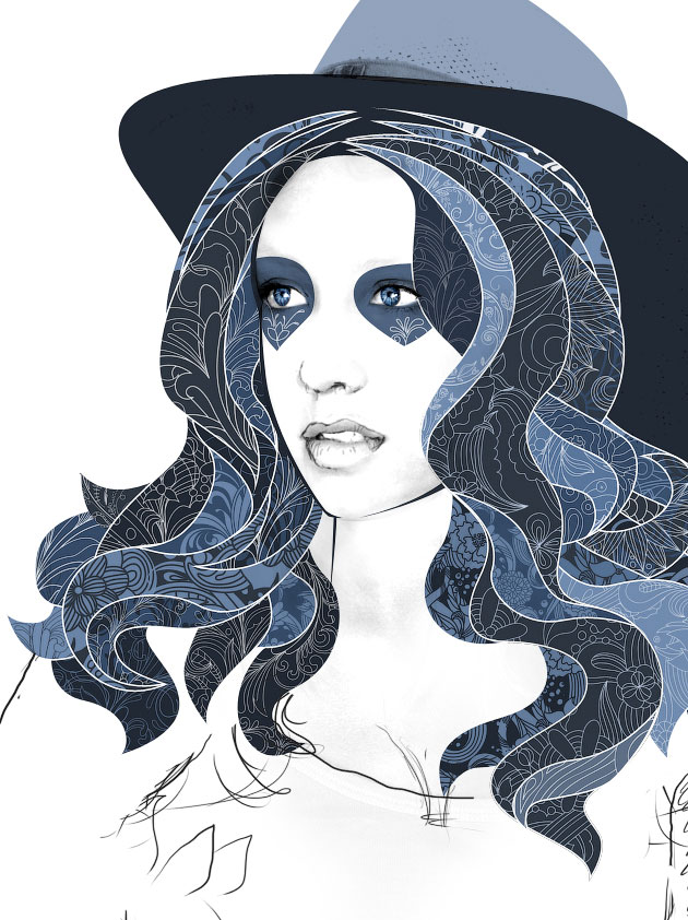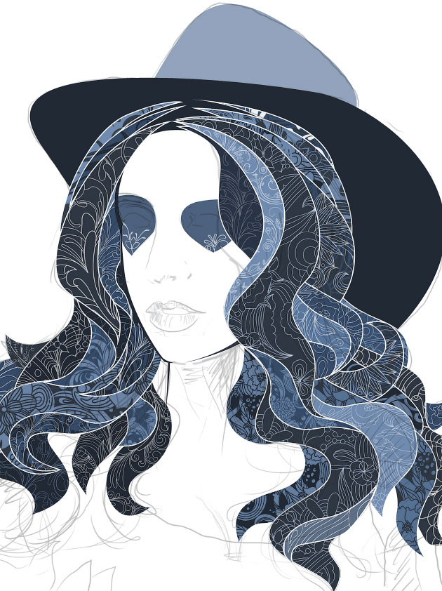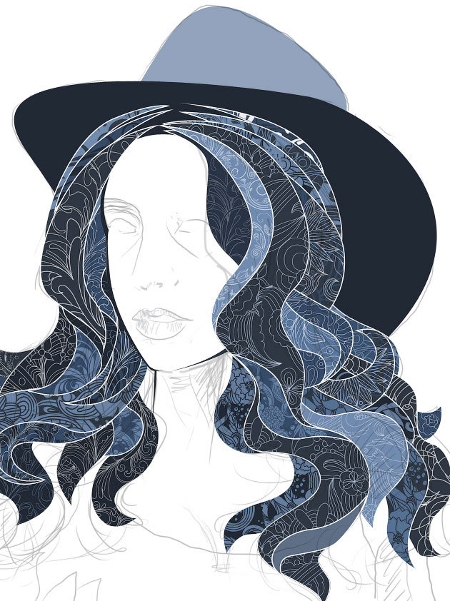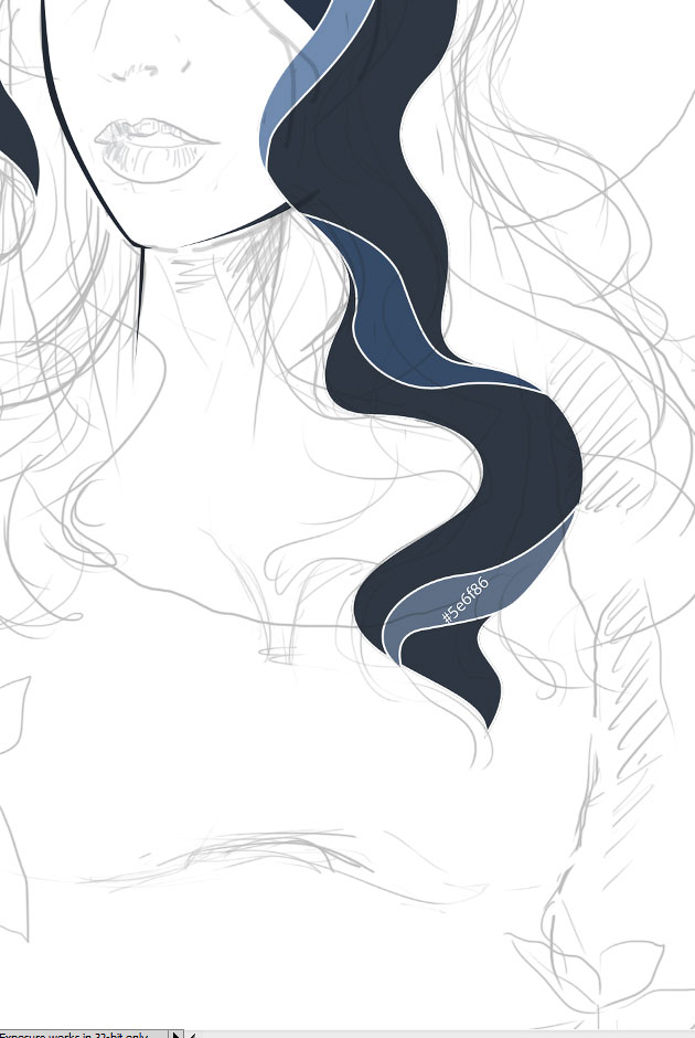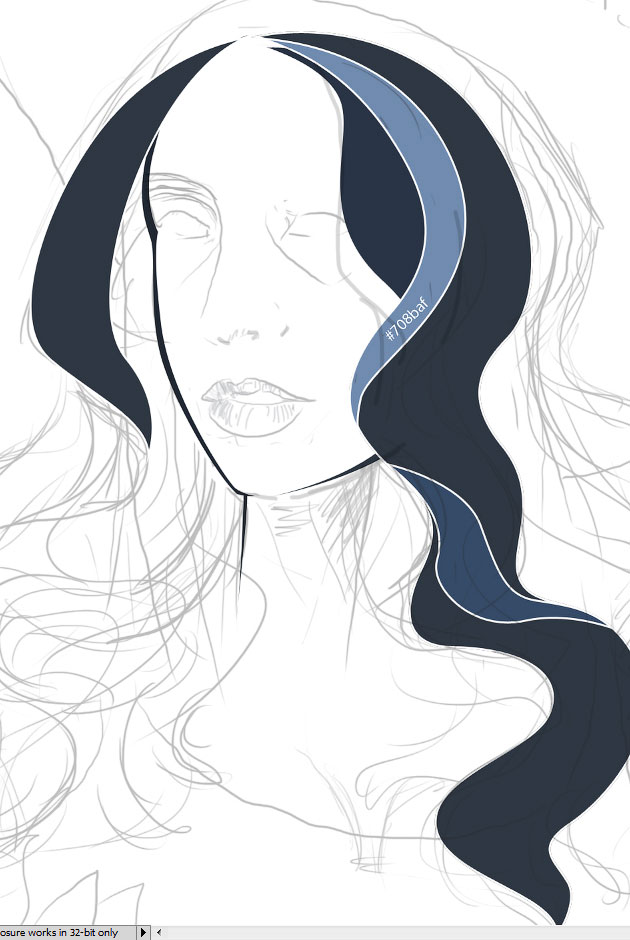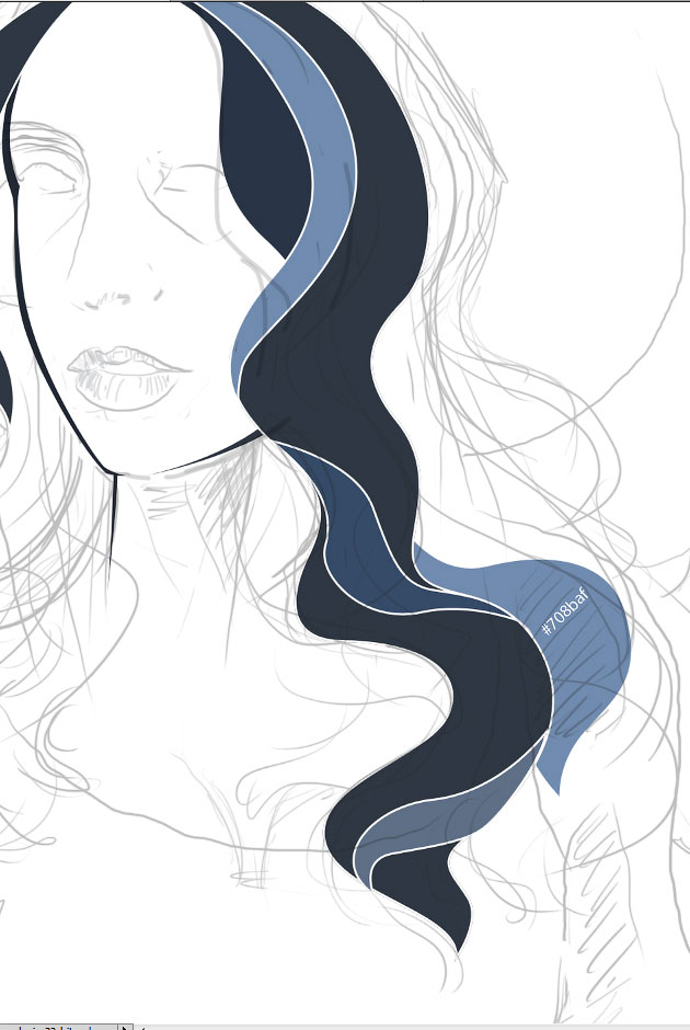 Нарисуйте несколько фигур, используя другие голубые тона #708baf и #5e6f86 (примерно 3 или 4 будут смотреться хорошо). Если у вас нет опыта в рисовании волос, то не стесняйтесь использовать исходное изображение как подсказку.