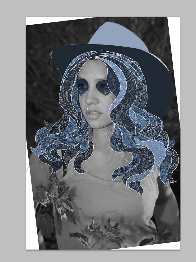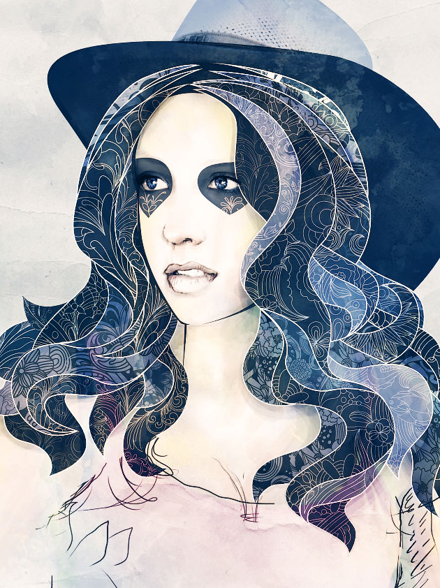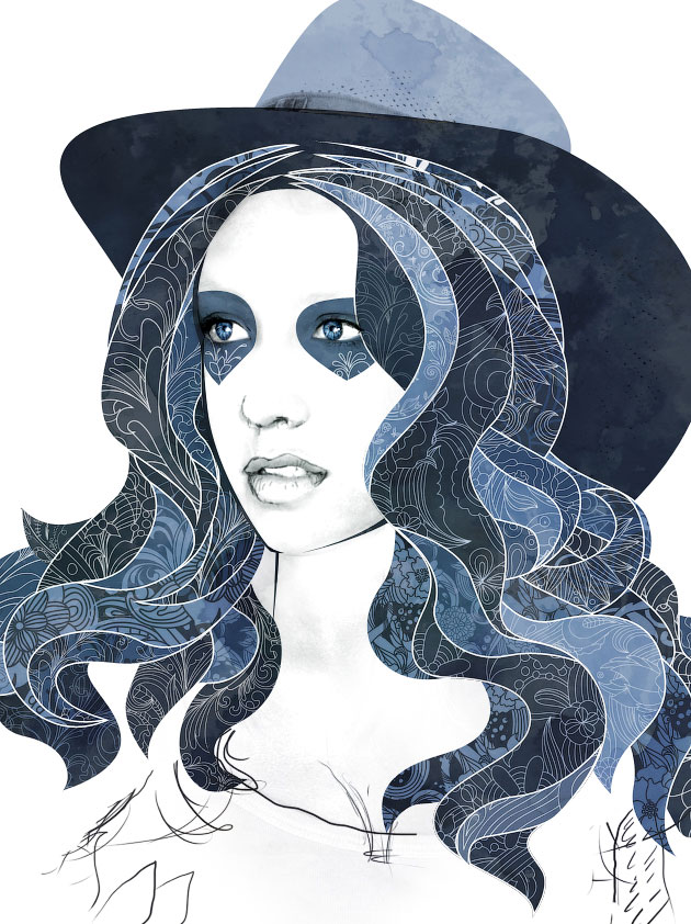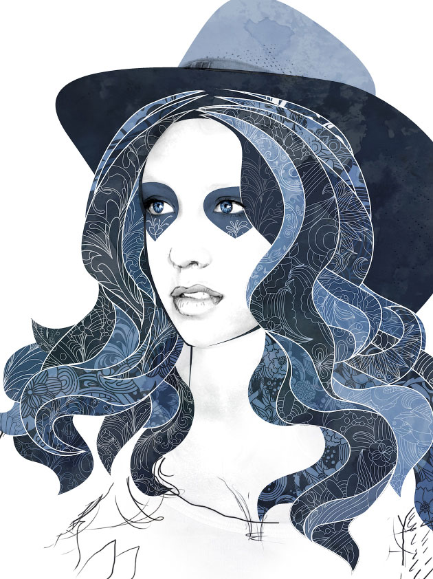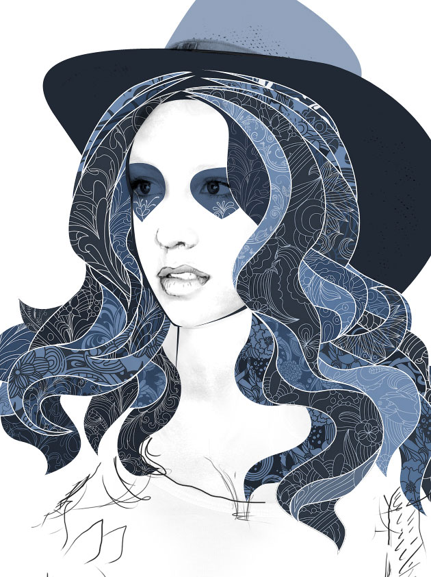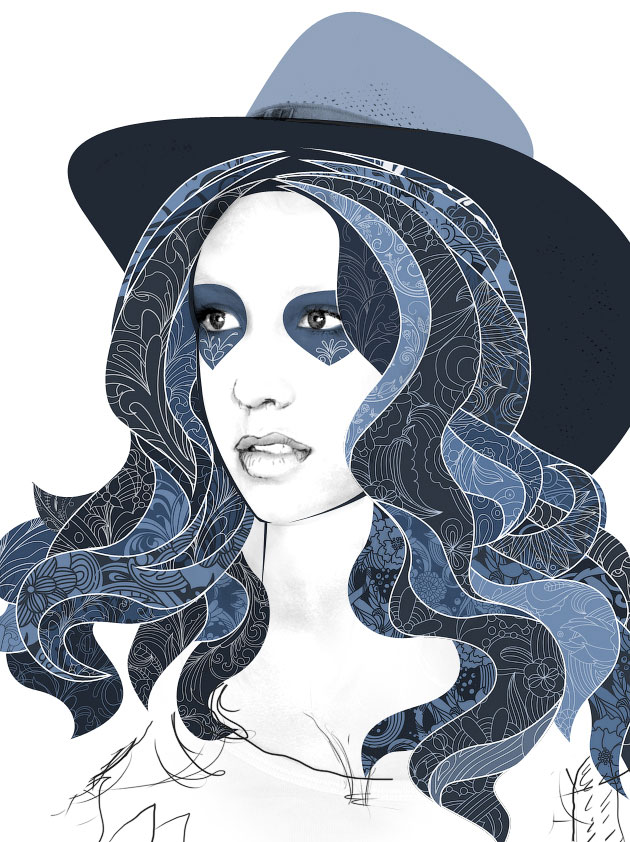 Нарисуйте несколько фигур, используя другие голубые тона #708baf и #5e6f86 (примерно 3 или 4 будут смотреться хорошо). Если у вас нет опыта в рисовании волос, то не стесняйтесь использовать исходное изображение как подсказку.