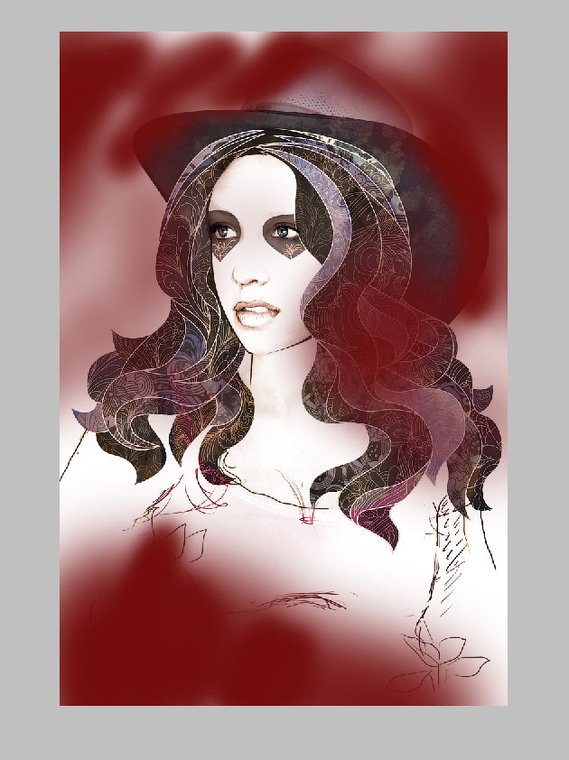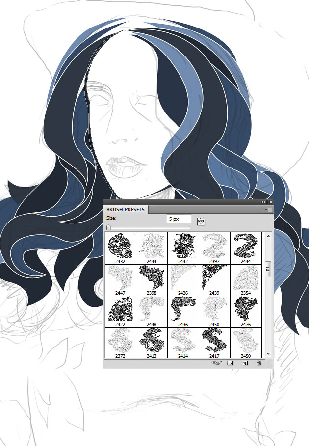 Сейчас все выглядит плоским и скучным, так давайте добавим текстуры к волосам! Загрузите нужные нам кисти с узорами в палитру и нажмите F5.