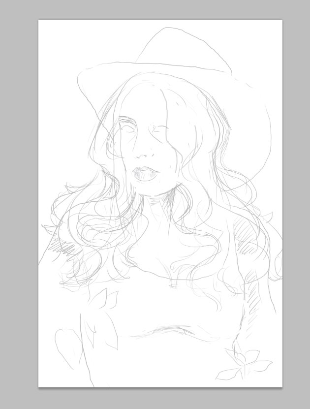 На данный момент нам не нужна копия слоя с девушкой, поэтому можно выключить его видимость. Сейчас из наброска мы можем сделать все что хотим, при этом изображение с девушкой уже не будет нам мешать. На данный момент эскиз выглядит хорошо.